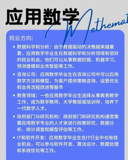 数学与应用数学专业是一个涵盖数学基础理论与应用,培养学生运用数学知识解决实际问题的能力的专业。对于女生而言,这个专业同样是一个值得考虑的选择,因为: