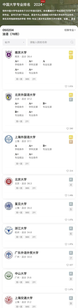2024年中国大学法语专业排名(研究型)中,武汉大学位列冠军。