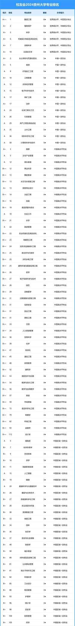 根据提供的信息,以下是贵州大学在2024年的部分优秀专业排名情况: