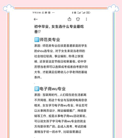 选择专业时,建议初中女生结合自己的兴趣、特长和市场需求,做出最适合自己的决定。同时,也可以咨询学校老师、家长或职业规划师,获取更多的信息和指导