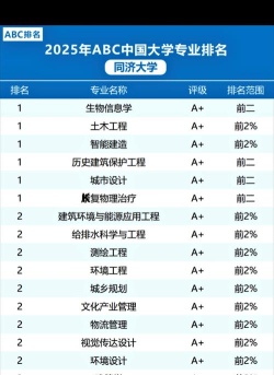 同济大学在多个学科领域具有很高的排名和认可度。以下是一些同济大学的专业排名信息: