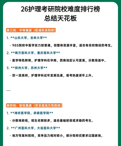 护理专业考研的难度排名通常基于多个因素,包括院校的层次、招生人数、分数线、题型难度等。以下是根据提供的信息整理的护理专业考研难度排名: