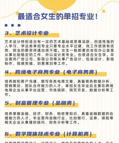 以上专业根据近年来的趋势、市场需求以及女生的兴趣特点,在女生中普遍具有较高的受欢迎程度。选择专业时,建议考虑个人兴趣、能力以及未来的职业规划