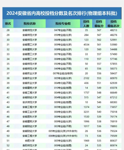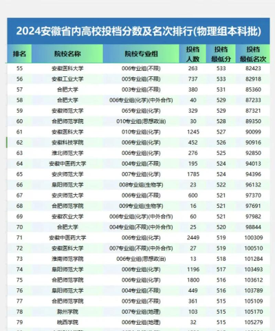 根据提供的信息,以下是安徽省理科专业的排名情况: