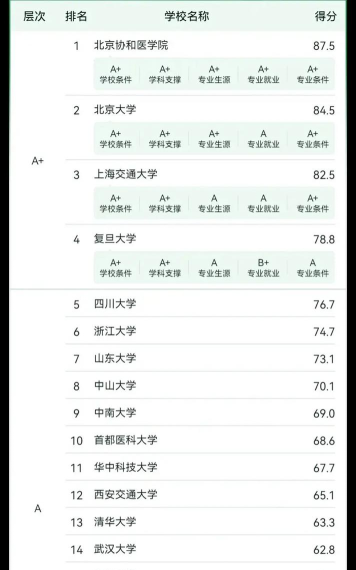 排名前三位的是北京协和医学院、北京大学和上海交通大学。