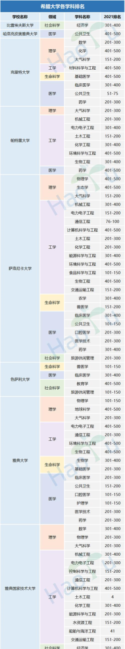 希腊在多个学科领域都有高等教育机构,并且在一些国际排名中表现良好。以下是一些希腊大学在特定学科的排名情况: