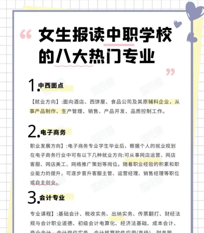 初中女生在选择专业时,可以考虑以下几个领域,这些领域通常适合女生,并且有较好的就业前景: