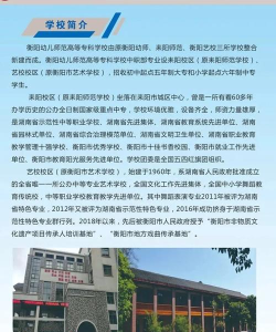 学校是湖南省示范性中等职业学校,衡阳市卓越中等职业学校,是国家级幼儿园转岗教师培训基地,湖南省幼儿园园长、骨干教师和保育员培训基地,衡阳市小学、幼儿园骨干教师培训基地。学校建设了教育类和社会服务类两个专业群,开设了五年制大专和三年制中专两个层次的专业,其中五年制大专有学前教育和小学教育两个专业,三年制中专开设有学前教育、艺术表演、计算机应用、动漫游戏与设计、市场营销、旅游服务与管理、酒店服务与管理等七个专业。学校以省级特色专业学前教育专业为龙头,形成了师范教育与艺术教育相结合、师范教育与非师范教育相结合、职前培养与职后培训相结合、全日制教育与成人教育相结合的办学特色。现有在校全日制学生4000多人,办学以来,已培养了3万余名幼儿园和小学师资,5000多名其他专业技术人才,学生就业率100%,对口就业率达到98%。