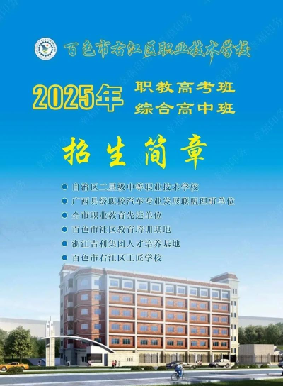 百色市右江区职业技术学校是一所集中等全日制学历教育、成人教育、短期技能培训为一体的公办职业技术学校。学校始建于1968年,位于右江区城北二路17号,占地37亩,校舍面积4258.18平方米。自治区合格职业学校,毕业生初次就业率100%,学校面向全百色市招生。