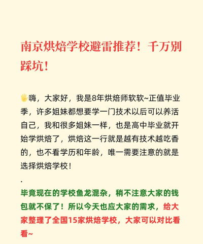 南京的烘焙学校众多,每所学校都有其特色和专业方向。以下是部分知名的南京烘焙学校及其专业排名信息,这些信息基于发布时间和内容的相关性进行整理: