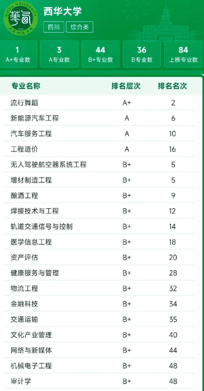 西华大学在多个学科领域有着较好的排名,以下是根据最新信息整理的专业评估排名情况: