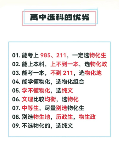 二、结合学习情况。经过小学和初中,如果数、理、化学得不错,而且也比较喜欢,那选择理科就比较好;如果政治、历史学得可以,又对这些有兴趣,不妨选择文科;有些同学什么都好,选理比较合适,有些同学什么都一般,选报文科合适,对于学习较困难学生,选什么都无所谓。当然,语文和英语,无论文理都不要太差,高考完全一样。建议语、数、外成绩可以,而理、化成绩较差,又没兴趣的同学,选报文科合适。