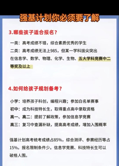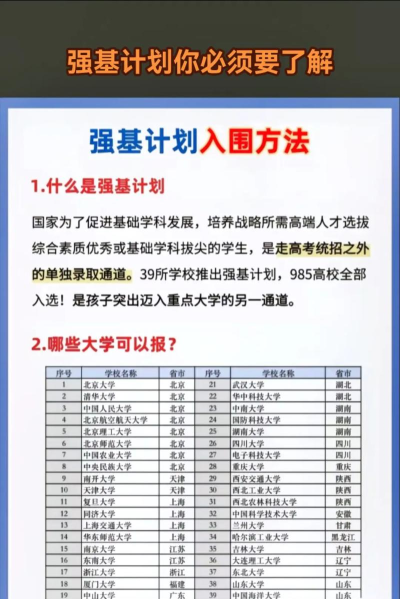强基计划主要选拔培养有志于服务国家重大战略需求且综合素质优秀或基础学科拔尖的学生。聚焦高端芯片与软件、智能科技、新材料、先进制造和国家安全等关键领域以及国家人才紧缺的人文社会科学领域,由有关高校结合自身办学特色,合理安排招生专业。要突出基础学科的支撑引领作用,重点在数学、物理、化学、生物及历史、哲学、古文字学等相关专业招生。建立学科专业的动态调整机制,根据新形势要求和招生情况,适时调整强基计划招生专业。