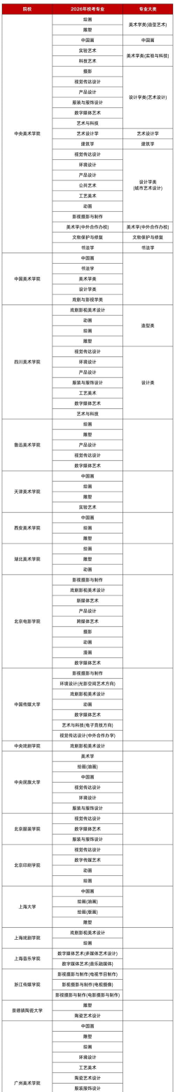 校考学校有中央美术学院、中国美术学院、四川美术学院、天津美术学院、鲁迅美术学院、湖北美术学院、西安美术学院、广州美术学院、山东工艺美术学院、吉林艺术学院、山东艺术学院、广西艺术学院、云南艺术学院、新疆艺术学院、中国传媒大学等。