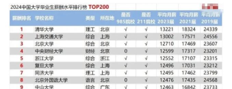 根据中国薪酬网发布的《2024年全国高校毕业生薪酬排行榜TOP200》,清华大学以平均月薪13221元位居榜首,上海交通大学以13002元紧随其后,北京大学以12710元位列第三。以下是部分薪资排名情况: