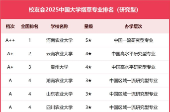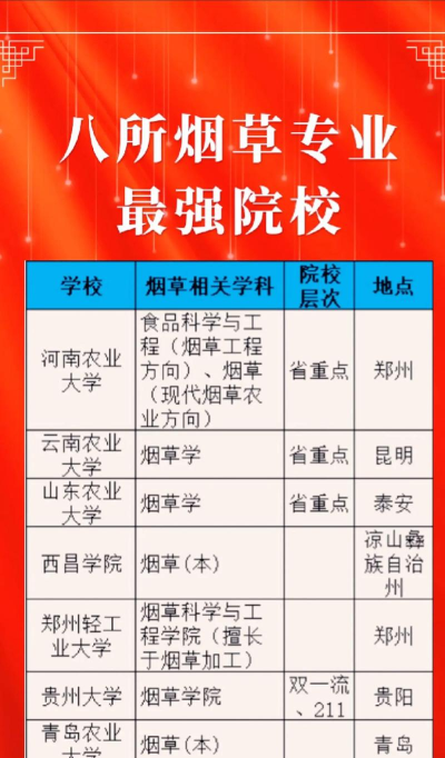 当前,根据最新的排名信息,以下是2024年烟草专业院校排名情况: