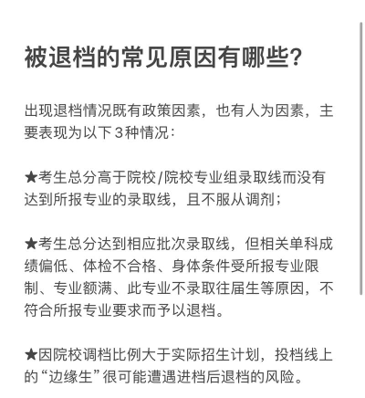 进档后遭遇退档的原因是多方面的,但主要的一个因素是考生对所报院校的《招生简章》中要求的报考资格、学校情况及专业要求等相关内容不了解,盲目填报引起的,志愿填报一定要看清专业报考的条件。