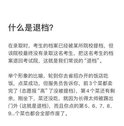 如果考生在填报专业中分数不算高,专业又不服从调剂,就会造成进档后被退档。