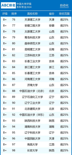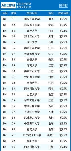 根据提供的信息,以下是2024年中国自动化专业排名情况: