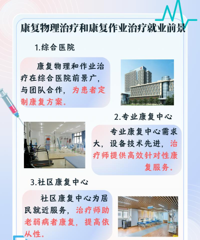 毕业生可以在多种机构找到工作,包括综合医院康复医学科、康复医院、社区医疗机构康复部、养老服务机构、特殊学校、体育团队等。