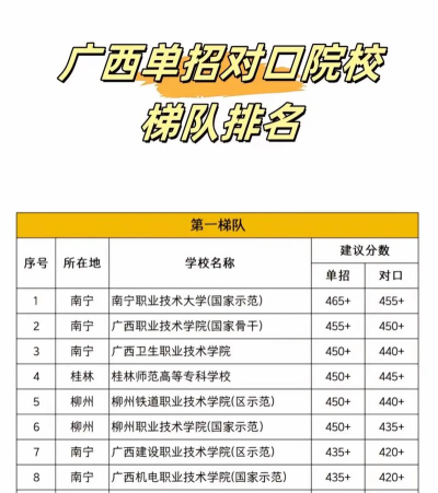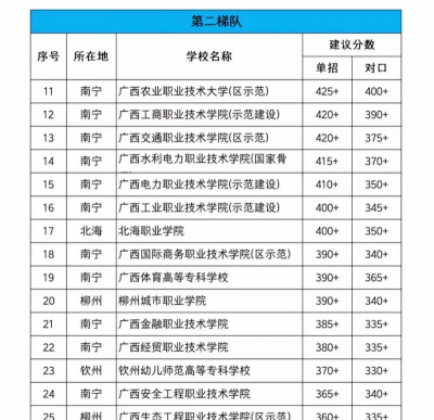 根据提供的信息,以下是广西各校单招专业的排名情况: