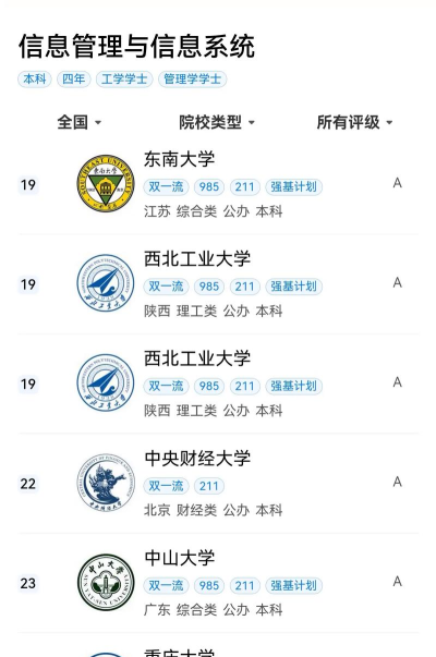 根据提供的信息,以下是管理信息相关专业(信息管理与信息系统、信息资源管理等)的大学排名情况: