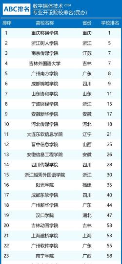 根据提供的信息,以下是2024年数字媒体设计专业(包括数字媒体艺术和数字媒体技术)的部分大学排名情况: