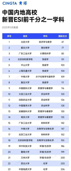 某校(未具体说明):农业科学学科首次进入ESI全球排名前1‰,该校拥有ESI全球排名前1%学科12个,ESI前1‰学科1个。