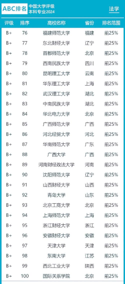 根据提供的信息,以下是2024年中国法学专业排名的部分情况: