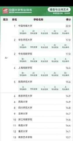 中国传媒大学在2024年全国播音与主持艺术专业排名中也位于前列,具体排名情况未详细列出。