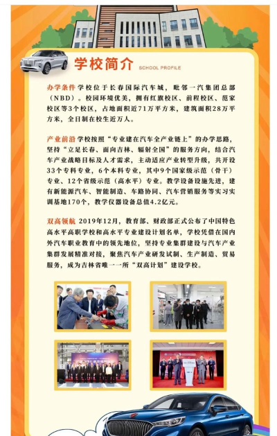 吉林省省级示范专业:机电一体化技术,汽车造型技术,汽车电子技术,汽车技术服务与营销,模具设计与制造技术
