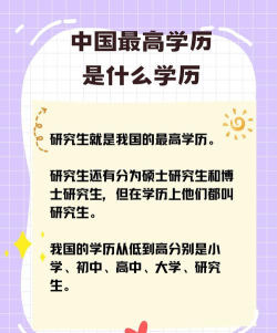 我国的学历从低到高分别是:小学、初中、高中、大学、研究生。换句话来说,研究生就是我国的最高学历。当然,研究生还有分为硕士研究生和博士研究生,但在学历上他们都叫研究生。类似于大专和本科都叫大学,中专和高中都属于高中。当然,他们之间肯定是有区别的。