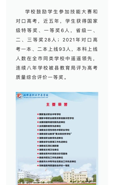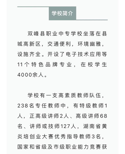 双峰县职业中专学校坐落在县经济开发区内,校园面积150多亩,现有专任教师235人,其中特级教师和省级学科带头人3名,县级以上骨干讲师21名,高级讲师57名,讲师98名。全日制在籍学生3827名,学校是湖南省示范性职业中专、国家重点职业中专、国家中等职业教育改革发展示范学校,先后被评为双峰县养成教育先进单位、双峰县文明单位、娄底市校园文化建设十佳学校、湖南省文明卫生单位、湖南省职业学校学生管理先进单位、全国和谐校园建设先进学校。连续四年荣获娄底市技能、文化课抽考先进单位及双峰县高考质量综合评价一等奖。作为国家示范校,双峰县职业中专学校已大步迈进全国职教名校行列,学校的办学特色和办学经验在娄底日报、湖南日报、湖南教育、中国青年报、中国教育报等报刊杂志上广为宣传和推介。