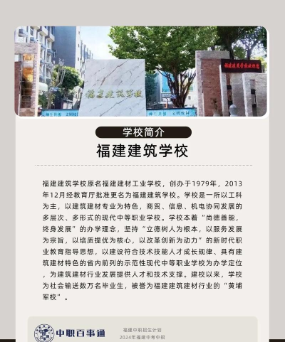 福建建筑学校原名福建建材工业学校,创办于1979年,原隶属福建省建材工业总公司,2003年1月划转教育厅管理,2013年12月经教育厅批准更名为福建建筑学校。学校是一所以工科为主,以建筑建材专业为特色,商贸、信息协同发展的多层次、多形式的现代中等职业学校。学校本着“尚德善能,终身发展”的办学理念,坚持“立德树人、服务发展、促进就业、提高质量、改革创新”的指导思想,以建设符合技术技能人才成长规律、具有建筑建材特色的省内前列的示范性现代中等职业学校为办学定位,为建筑建材行业发展提供人才和技能支撑。建校以来,学校为社会输送数万名毕业生,被誉为福建建筑建材行业的“黄埔军校”。