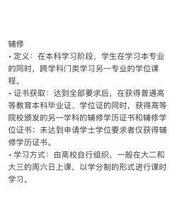 双学位/辅修:这是国内普遍的叫法,其实是辅修专业学位。由我国高等院校参考国外的”双学位“制度,自我创新,由学校颁发学位的新制度。达到全部要求后获得教育部统一制作、授权颁发、学信网注册的普通高等教育本科毕业证、学位证的同时,获得高等院校颁发的另一学科的辅修专业证书(辅修学历证书)和高等院校颁发的双学士学位证书(辅修学位证书),未达到申请学士学位要求者可获得辅修学历(辅修证书、辅修结业证书)。
