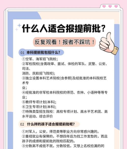 像国家专项,高校专项,还有最出名的军事类高校,它们是要对你进行一个政审的等等。提前批里的大学和它们设置的专业一般都比较特殊而且数量还不少,所以就特地设置了一个提前批算是和正常批做一个区别。