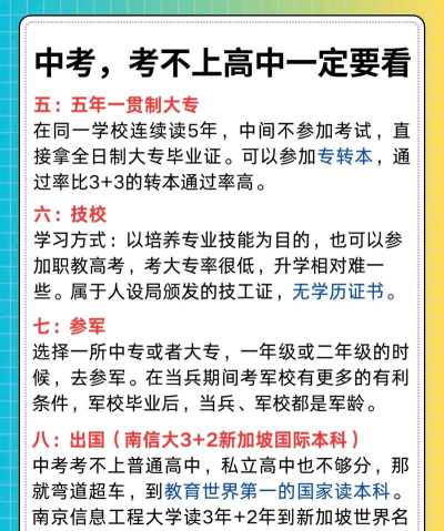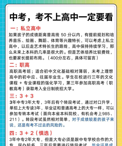 对于那些考不上高中的孩子来说,复读是最好的建议。考取重点高中或许有点难度,但是普通高中的门槛并不高。只要把精力都放在学习上来,绝大多数人都是有考上普通高中的实力。过去的初中三年,只要不是太贪玩,都能有一些知识的收获。在复读的时候,对那些弱势科目进行针对性补强。强迫自己多做一做题,多问问老师,这样复读一年下来,会收到想要的效果。