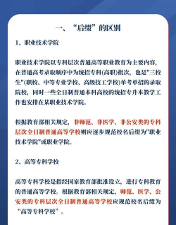 师范、医学、公安类的专科层次全日制普通高等学校应规范校名后缀为“高等专科学校”,而非师范、非医学、非公安类的专科层次全日制普通高等学校则应逐步规范校名后缀为"职业技术学院"。