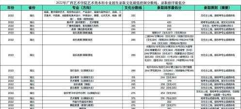 开设艺术类专业的大学有:广西大学、广西科技大学、桂林电子科技大学、桂林理工大学、广西师范大学、广西师范学院、广西民族师范学院、河池学院、玉林师范学院、广西艺术学院、广西民族大学、百色学院等。