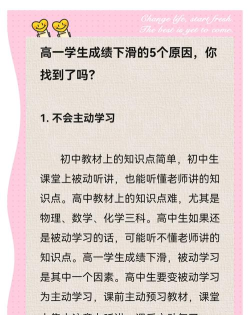 更多的同学是还像初中那样,有很强的依赖心理,跟随老师惯性运转,没有掌握学习主动权。表现在不定计划,坐等上课,课前没有预习,对老师要上课的内容不了解,上课忙于记笔记,一知半解,没有真正理解所学内容,依赖于考试前的复习等。而事实上高一所学的知识贯穿高中学习的始末,高一学得好不好,直接影响高中三年的学习。