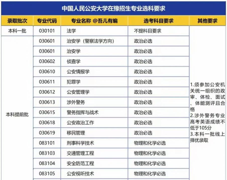 如果你们省已经实行新高考,采取3+3模式,从中国人民公安大学公布的2020年本科招生选考科目要求看。选择政治,可以报考警校里绝大部分公安专业,细分的话,应该是法学里面的公安学类专业,和以前文科能报考的公安专业基本相同,比如侦查学,治安学,公安管理学,涉外警务,公安情报学,犯罪学,警务指挥与战术等等。