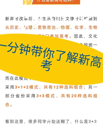 文理不分科:数学取消文数和理数;理、史,化、生、政、地(浙江还有通用技术)任选三科门(湖北实行“3+1+2”模式,后文会有详细介绍)参加高考。部分地区对选考科目实行等级赋分制。英语听力(部分地区有口语)和笔试分开,部分地区一年两考,取最佳成绩计入高考总分。