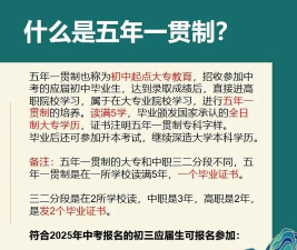 五年制通常是指3年中专+2年大专,也就是说,初中毕业生进入五年制高职之后,先念3年的中专课程,学的是中职知识和专业技能,之后不用参加高考,直接升入大专,读2年的高等职业教育,毕业后获得大专毕业证。