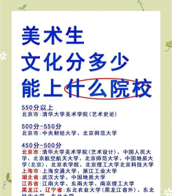 美术生高考文化分要450-500,专业分至少250。不同省份,甚至不同院校的艺术类考生录取分数计算方式都是不一样的。