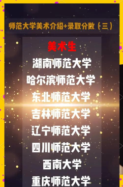 适合美术生的师范大学有湖南师范大学(双一流)、西南大学(双一流)、哈尔滨师范大学、上海师范大学、福建师范大学、山东师范大学、新疆师范大学等。
