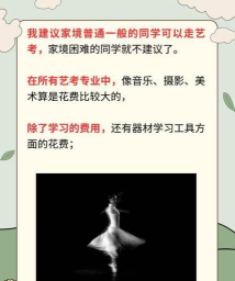 家庭条件一般,但孩子有天赋,也有兴趣,可以尝试。家庭条件一般,只想把艺考当作高考的捷径,不建议学。家庭条件一般,孩子自身也没有学艺考的条件,不建议学。