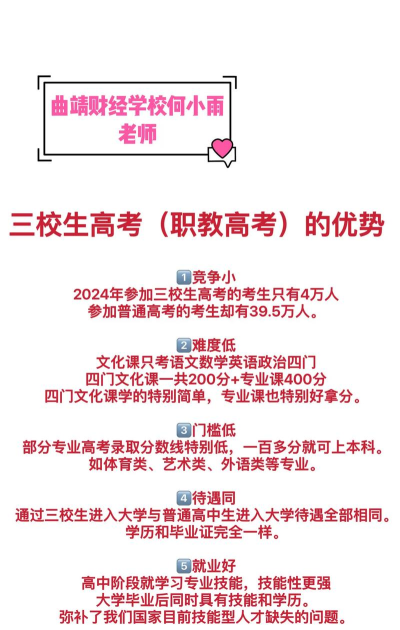 5、待遇:三校生一经大学录取之后,跟普通高中毕业生录入大学的待遇一样。