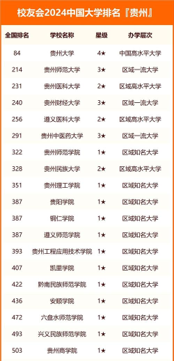 贵州大学在2024年校友会中国大学排名中位列全国第84名,名列2024中国综合类大学排名第37名,位列2024贵州省大学排名第1名。在2024中国大学专业分档排名中,贵州大学1个专业评为A++,11个专业评为A+,17个专业评为A,39个专业评为B+,36个专业评为B+,位居全国同类高校前列。