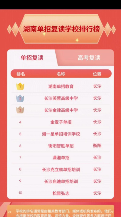 2022年湖南好的高考复读学校有:湖南长沙同升湖实验学校复读部、汉森高考复读培训学校、长沙云翼高考补习学校、江华县高考补习学校、育英高考补习学校等。