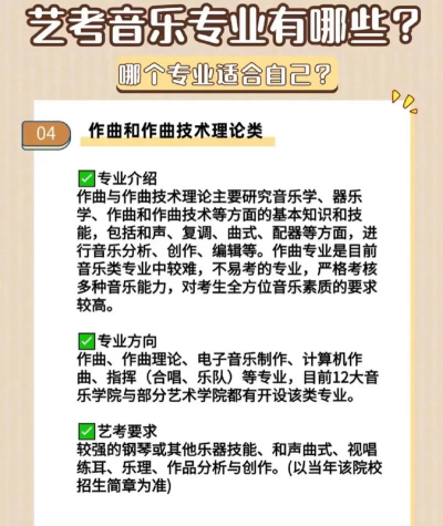 艺考音乐类专业有:乐器表演、声乐表演、音乐学、录音艺术、作曲与作曲技术理论、音乐教育等专业。